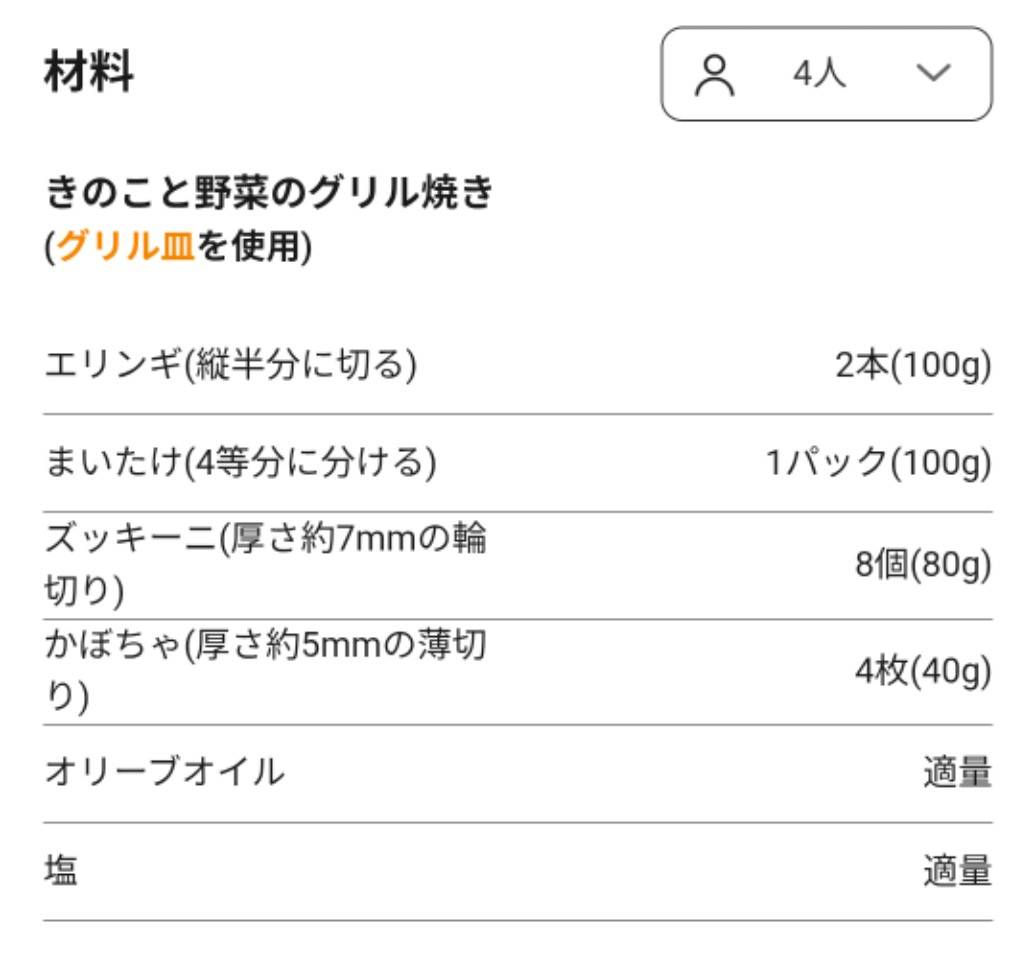 お持ちの商品のレシピを見ることができ、レシピにより人数分対応もできます。