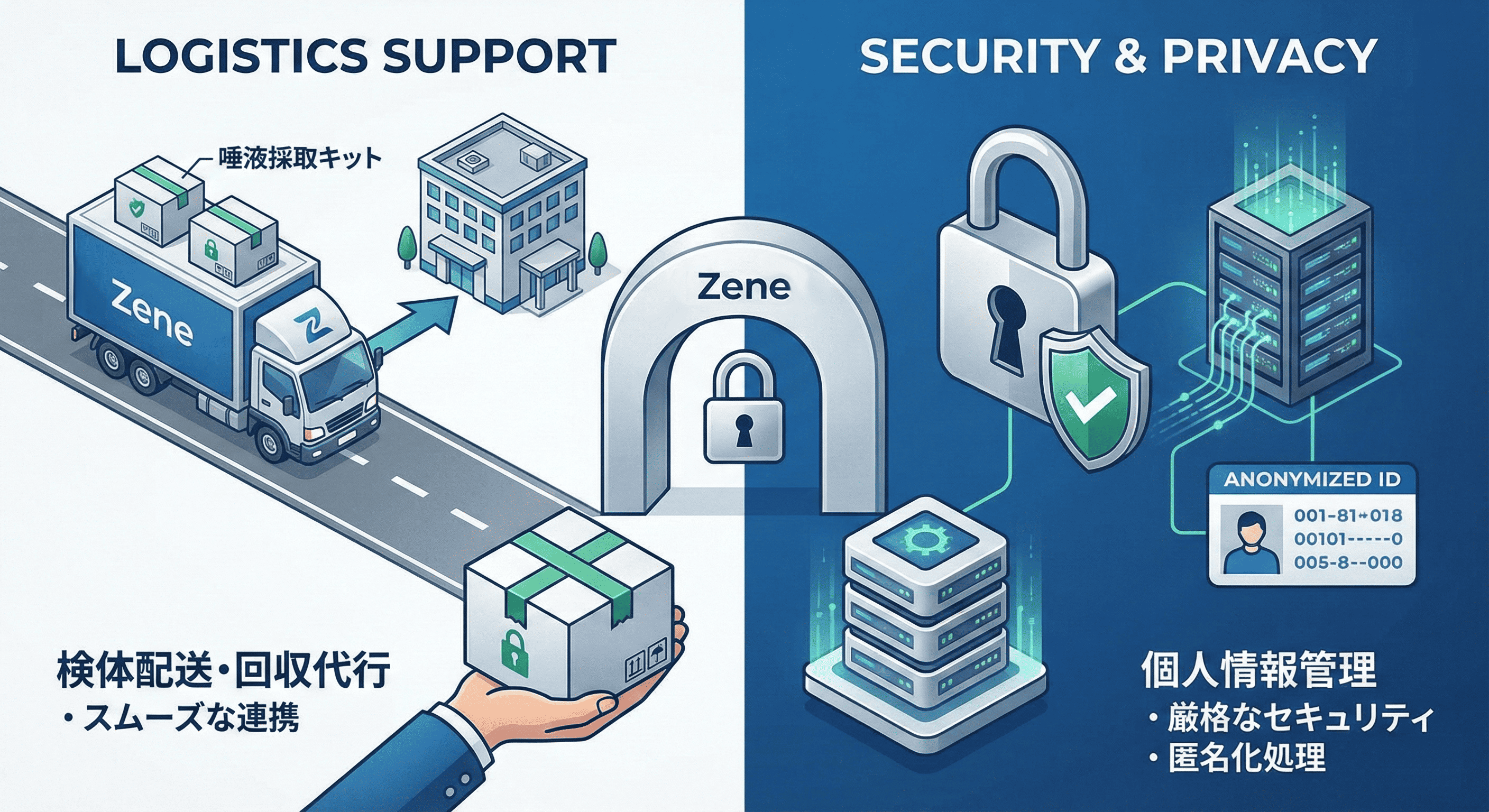 高品質な唾液採取キットの手配・配送代行はもちろん、最もセンシティブな「個人情報」の管理もZeneにお任せください。匿名化処理の徹底や厳格なセキュリティ環境でのデータ保管など、万全の管理体制を構築しています。煩雑な事務作業とリスク管理をアウトソースし、安心して研究計画に注力いただけます。
