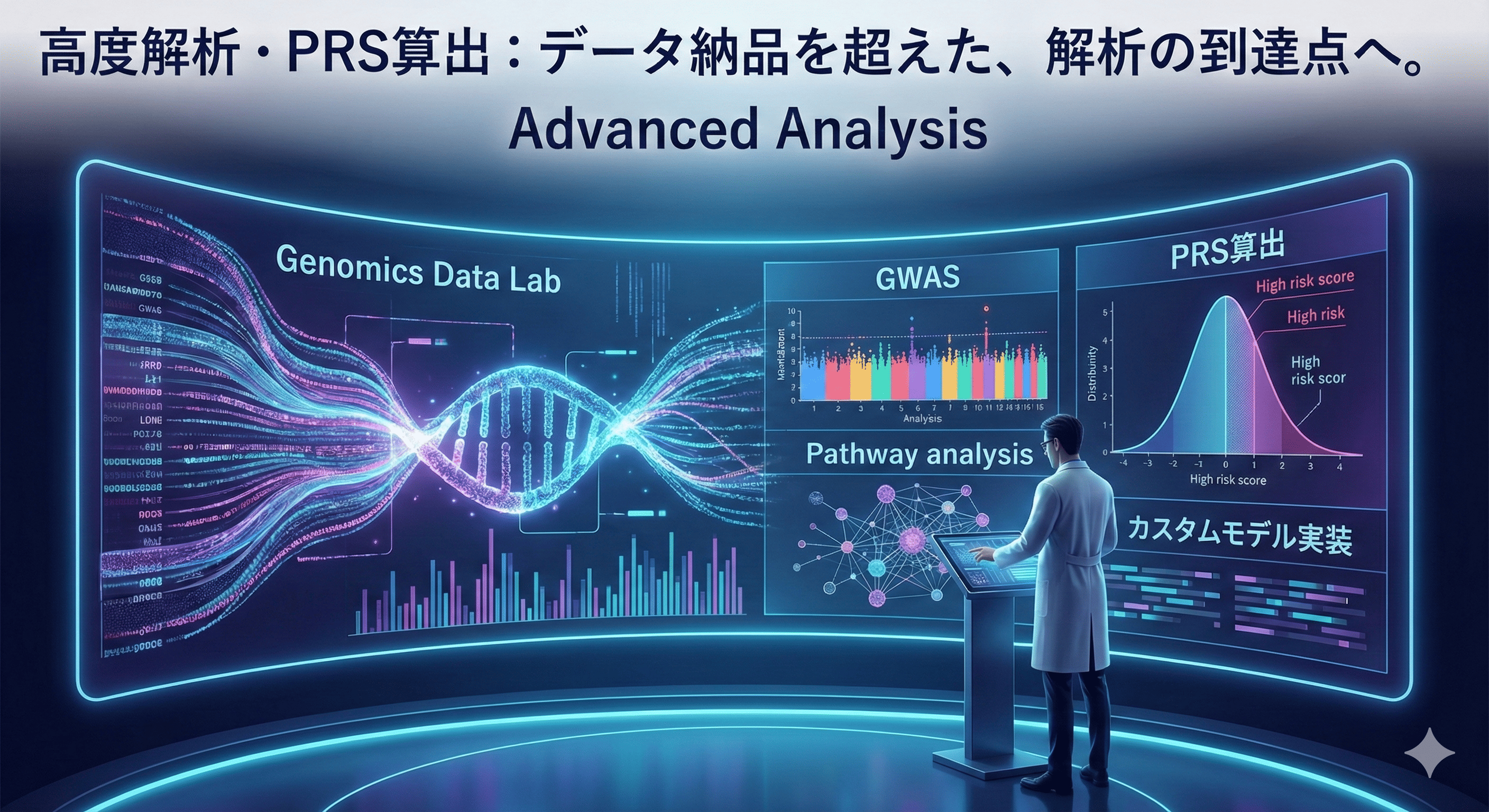 ウェット(実験)とドライ(解析)の分断を埋めます。研究計画書をご提示いただければ、データ解析まで一括で実施。一般的なGWAS解析だけでなく、ポリジェニックリスクスコア(PRS)の算出や、お客様独自の特定統計モデルの実装など、高度な解析ニーズにも柔軟に対応します。