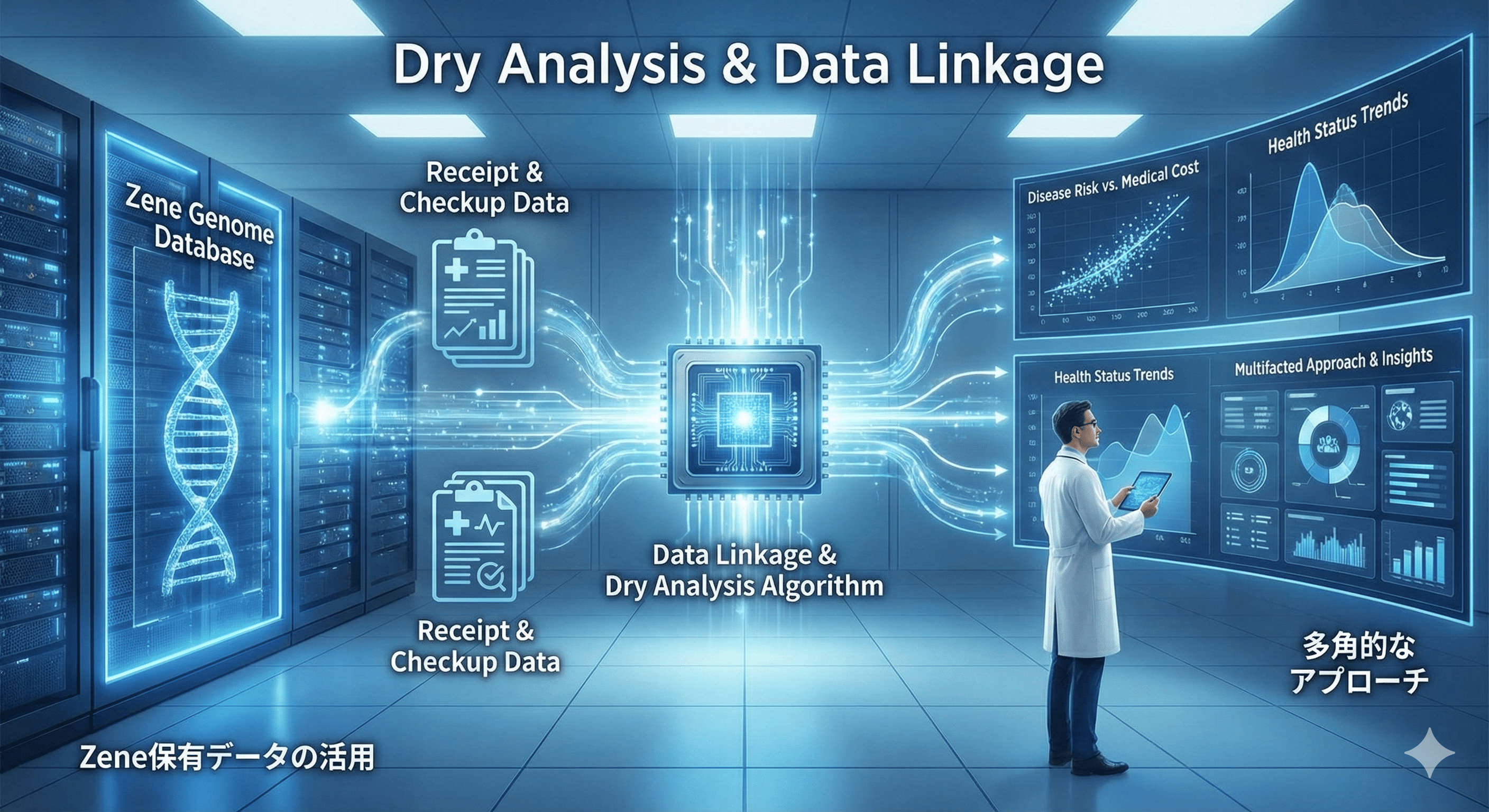 新たな検体採取(ウェット)を行わず、Zeneが保有する大規模な日本人ゲノムデータを活用したドライ解析も可能です。さらに、レセプト(診療報酬明細書)データや健康診断データとの突合解析も実施しており、疾患リスクと実際の医療費・健康状態の相関を分析するなど、多角的なアプローチを支援します。